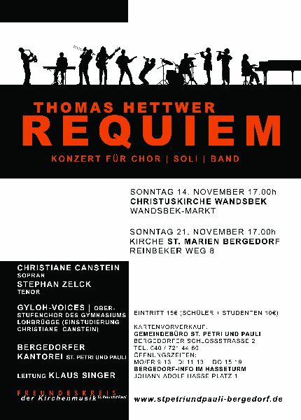 Am Sonntag, dem 14. November und am Sonntag, dem 21. November treten die Sopranistin Christiane Canstein und der Tenor Stephan Zelck, begleitet von den Gyloh-Voices und der Bergedorfer Kantorei, auf.
