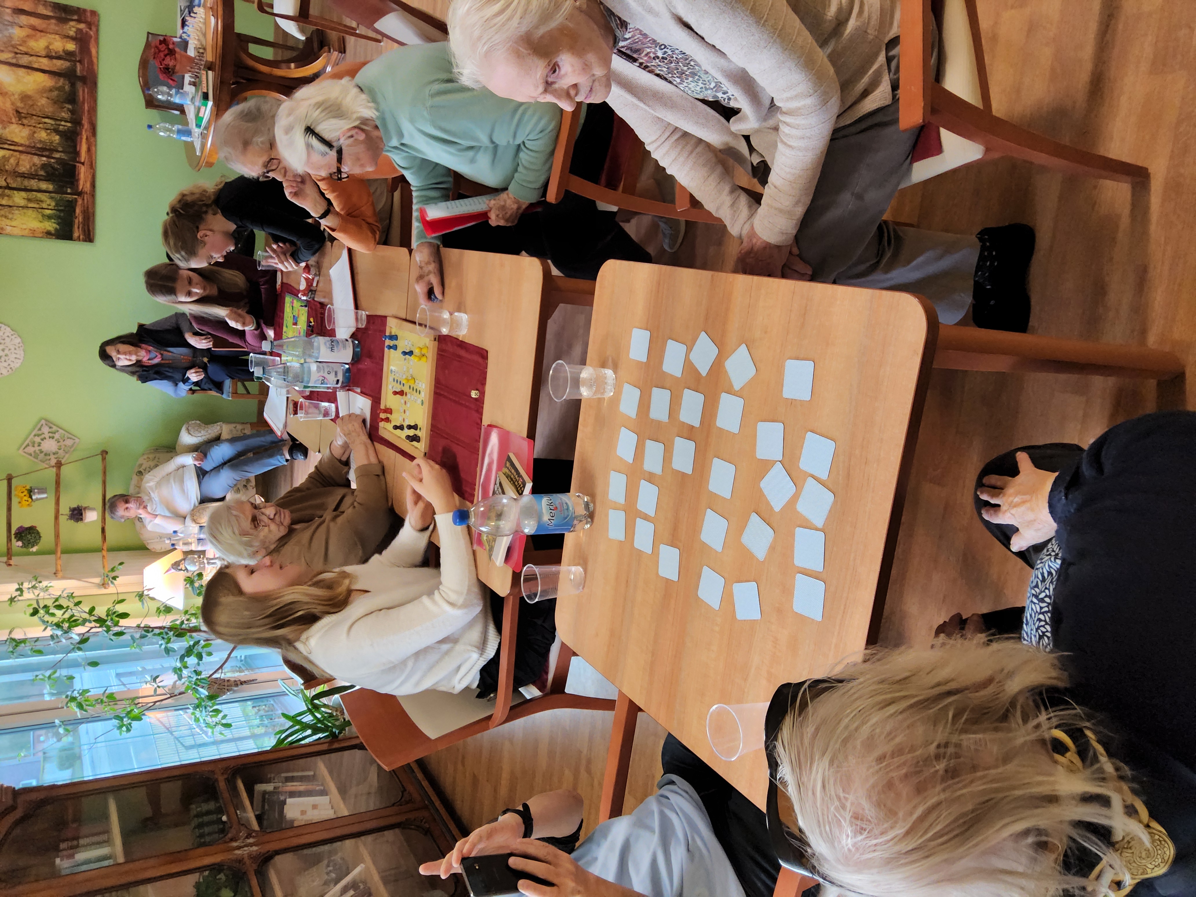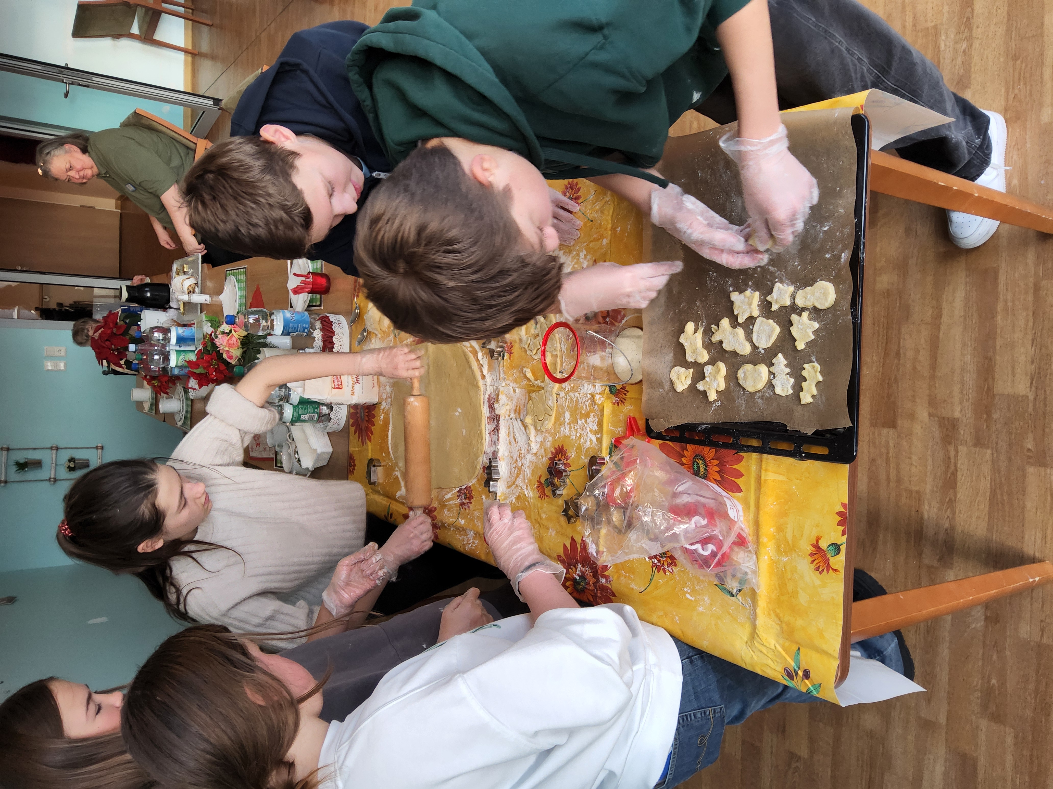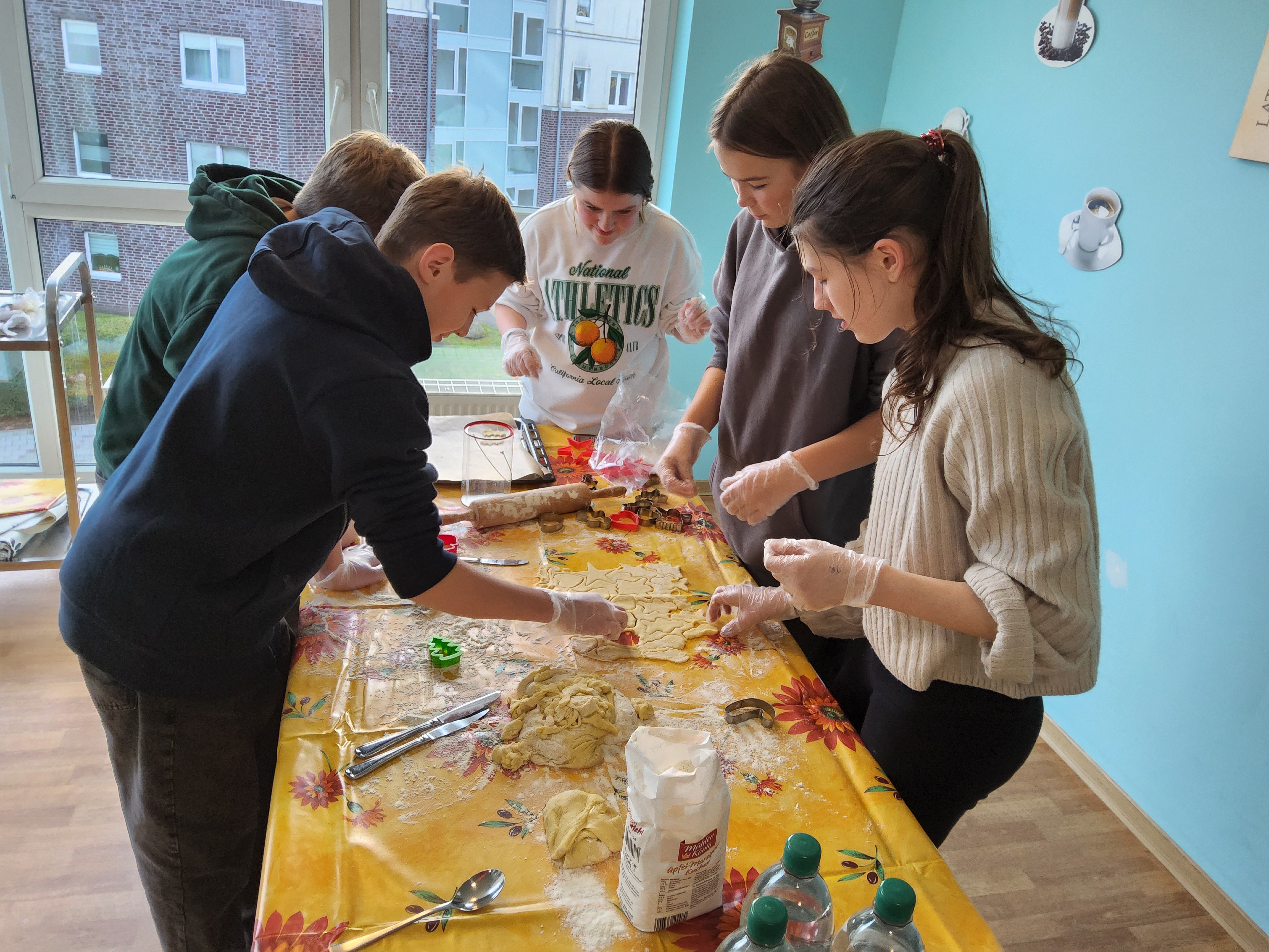 Die SchülerInnen hatten sich in mehrere Gruppen aufgeteilt, so dass während einige für die Senioren Kekse backten, andere mit den Senioren sangen und verschiedene Spiele spielten. Ganz „nebenbei“ entstanden Gespräche zwischen den Generationen, beispielsweise zum Thema „Schulzeit – früher und heute“.