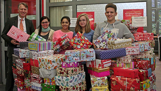 Weihnachtlich verpackt und gefüllt mit nützlichen und schönen Geschenken. Das haben unsere Schülerinnen und Schüler des Gymnasiums Lohbrügge geschafft und zeigen damit ihr soziales Engagement. Empfänger sind von Armut bedrohte Kinder unter anderem in Bulgarien, Weißrussland, Slowakei, oder Rumänien. Dementsprechend sind die Geschenke: Süßigkeiten, Kuscheltiere, Stifte und Zahnbürste, berichten Max Reis und Afzana Ahmadi, zwei der Schulsprecher, die die Aktion nach Anregung der Lehrerin Silja Nothdurft durchgeführt haben. Übergeben wurden die Päckchen dann der HASPA, die die weitere Verteilung übernommen hat.