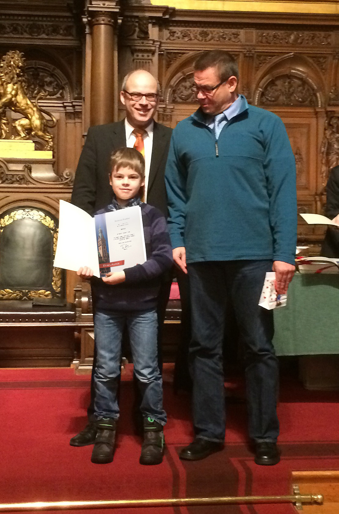 Nicholas Roether, Schüler unserer Nawi-Klasse 5d, hat einen ersten Preis bei dem naturwissenschaftlichen Wettbewerb NATEX gemacht und wurde dafür im Rathaus geehrt. Unter über 1000 Einsendungen gab es nur 31 erste Plätze. Wir gratulieren ganz herzlich zu diesem Erfolg!